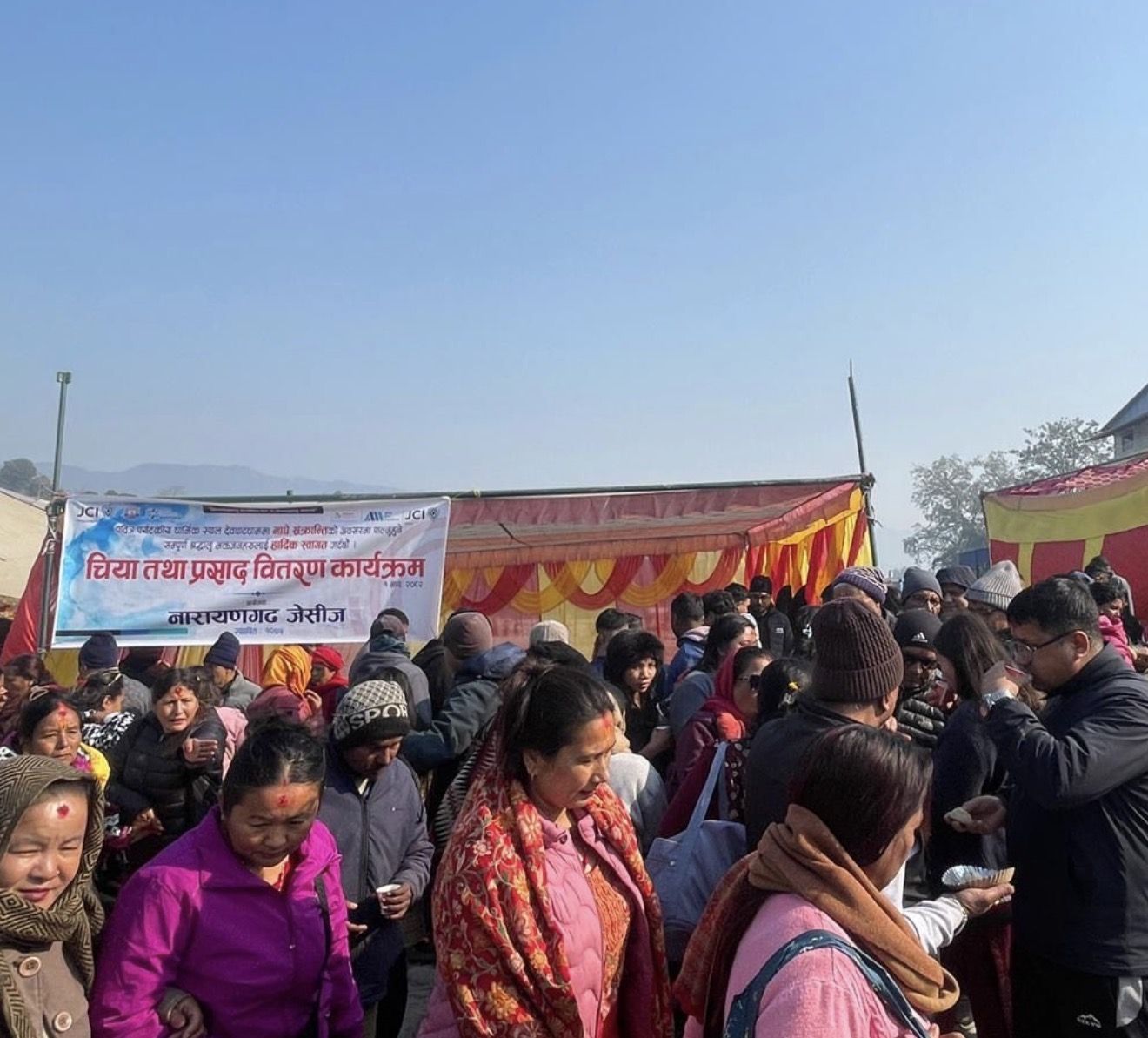 माघे संक्रान्ति पर्वको अवसरमा नारायणगढ जेसीज वर्ष २०२६ को पहिलो कार्यक्रमका रूपमा देवघाटधाम परिसरमा निःशुल्क चिया तथा प्रसाद वितरण कार्यक्रम सफलतापूर्वक सम्पन्न भएको छ। “मानवताको सेवा जीवनको सर्वोत्तम कार्य हो” भन्ने मूल मन्त्रलाई आत्मसात गर्दै आयोजना गरिएको उक्त कार्यक्रमले भक्तजन तथा तीर्थालुहरूलाई न्यानो आतिथ्य प्रदान गरेको छ।