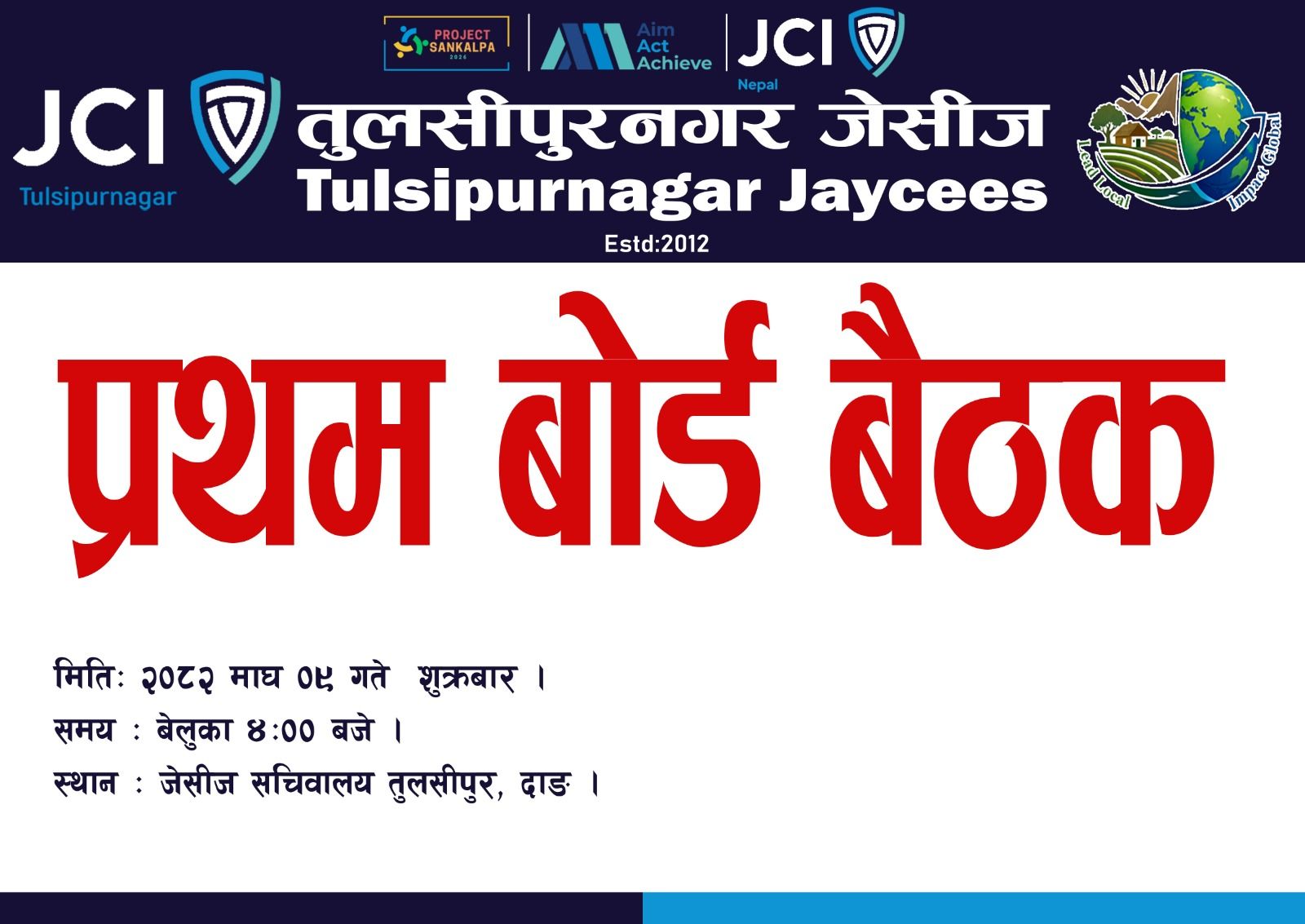 JCI Nepal (नेपाल जेसीज) is a non-profit voluntary membership based organization of young active citizens age 18 to 40 working in Nepal since 1964 for developing the Leadership, Personality and Entrepreneurship skills of young people of Nepal. Dr Bhekh Bhadur Thapa is the founder President of JCI Nepal (नेपाल जेसीज).