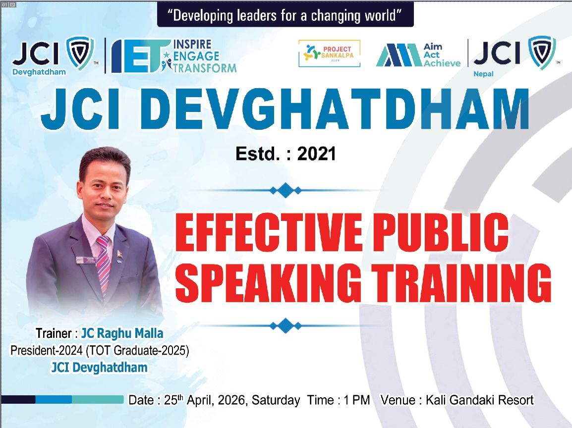 कार्यक्रमका संयोजक जेसी सन्तोष सुवेदी (उपाध्यक्ष–२०२६) रहनुभएको थियो भने सभापतित्व जेसी अर्जुन सुवेदी (अध्यक्ष–२०२६, देवघाटधाम जेसीज) ले गर्नुभएको थियो। तालिममा प्रशिक्षकका रूपमा पूर्व अध्यक्ष तथा JCI Nepal TOT Graduate–2025 जेसी रघु मल्लले सहजीकरण गर्नुभएको थियो।