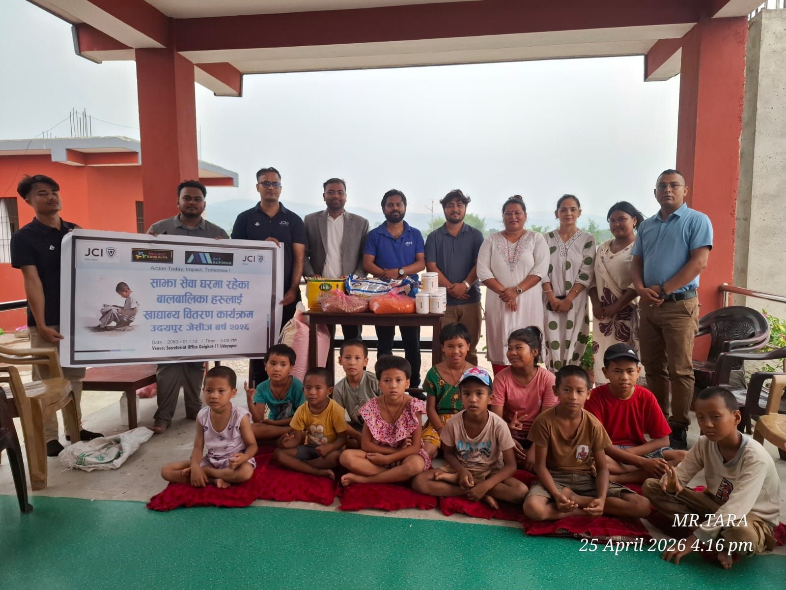 उदयपुर जेसीज वर्ष २०२६ का अध्यक्ष ब्रमदेब महतोको नेतृत्वमा गएको जेसीज टिमले भुजा १ बोरा दाल ५ केजि, चना ५ केजि, तेल एक कार्टुन , प्रोटिन भिटामिन १३ प्याकेट बितरण गरेको हो ।