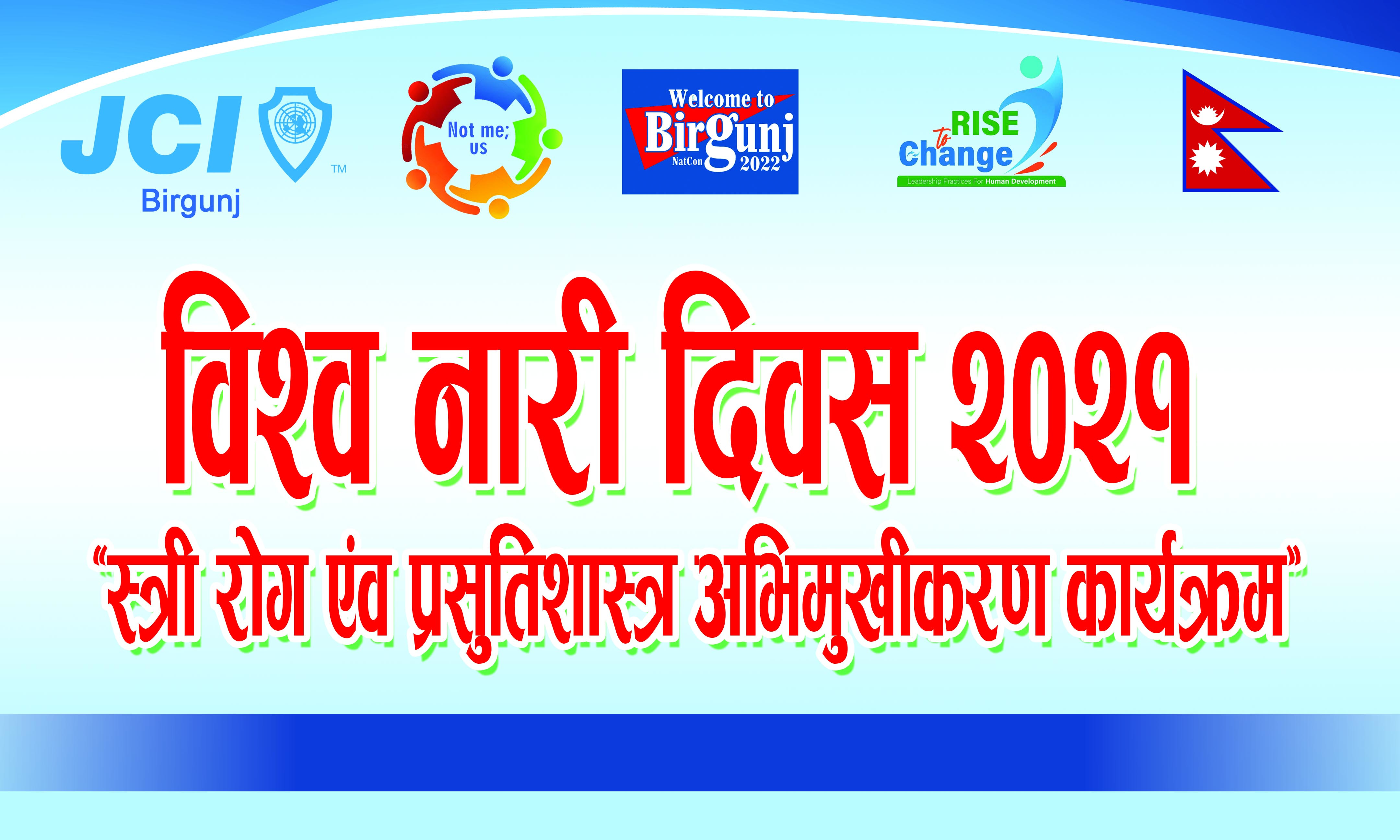 बिस्व नारी दिवस २०२१ को उपलक्ष्यमा मिती २०७७ फाल्गुन २४ तदानुसार ०८ मार्च , २०२१ सोमबार का दिन बीरगंज जेसीज वर्ष २०२१ को शाखा अध्यक्ष जेसी रंजन राउत ज्यु को सभापतीत्व मा " स्त्री रोग एंव प्रसुतिशास्त्र अभिमुखीकरण कार्यक्रम " बीरगंज पब्लिक कलेज, बीरगंज को सभाहल मा सम्पन भयो . आजको यस स्त्री रोग एंव प्रसुतिशास्त्र अभिमुखीकरण कार्यक्रम को गेस्ट स्पीकर डा. जगत दीप ज्यु रहनु भएको थियो भने प्रमुख अतिथी बीरगंज जेसीज को पुर्ब अध्यक्ष तथा नेपाल जेसीज को पुर्ब राष्ट्रिय अध्यक्ष तथा बीरगंज जेसीज वर्ष २०२१ को प्रमुख अध्यक्ष सल्लाहकार सीनेटर प्रो. डा. दीपक शाक्य ज्यु रहनु भएको थियो .